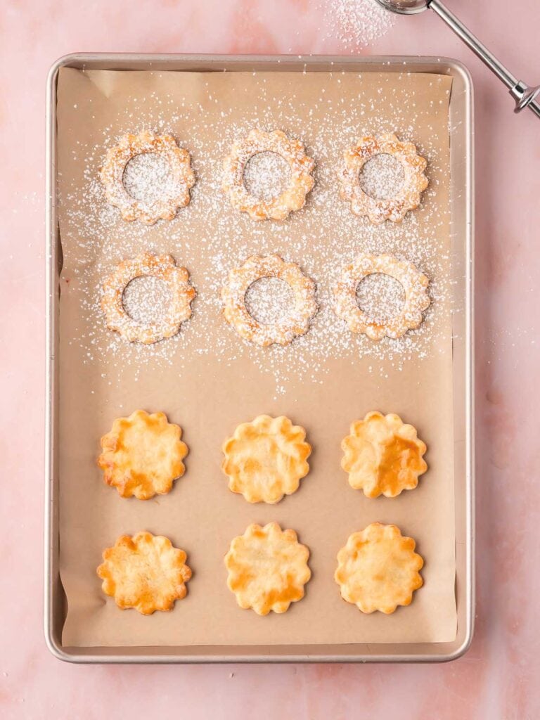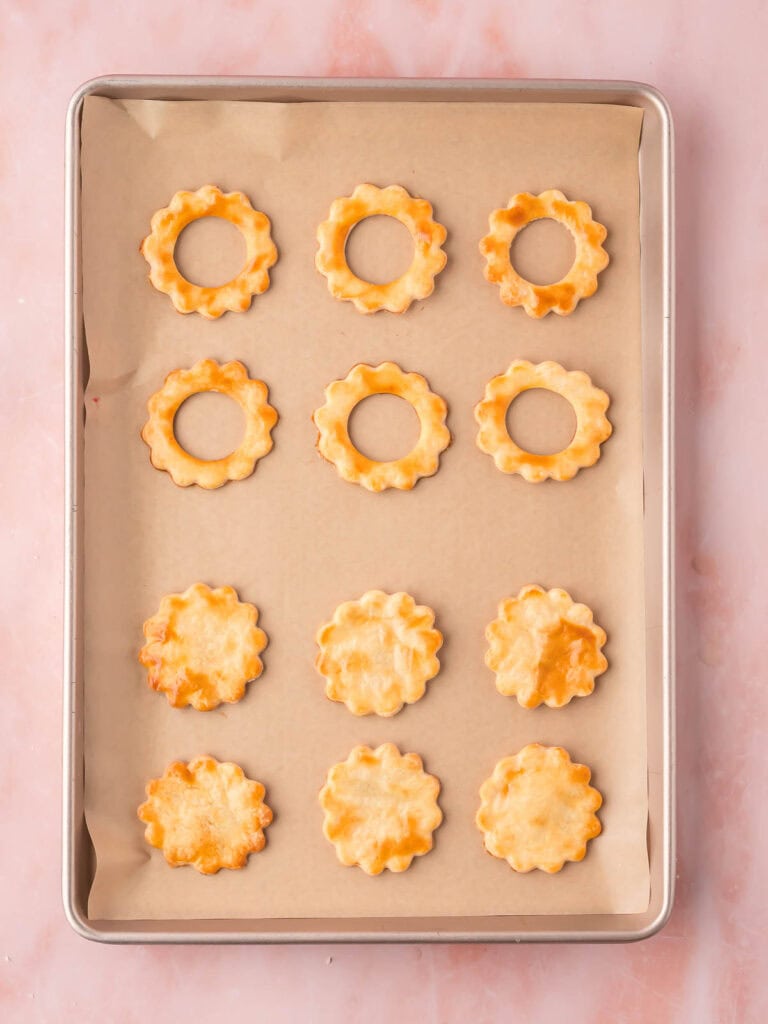 - Bake the tops and bottoms evenly: Even though the tops have the cutout, they should bake at the same time as the bottoms. Just keep an eye on them around the 12-minute mark to avoid over browning.